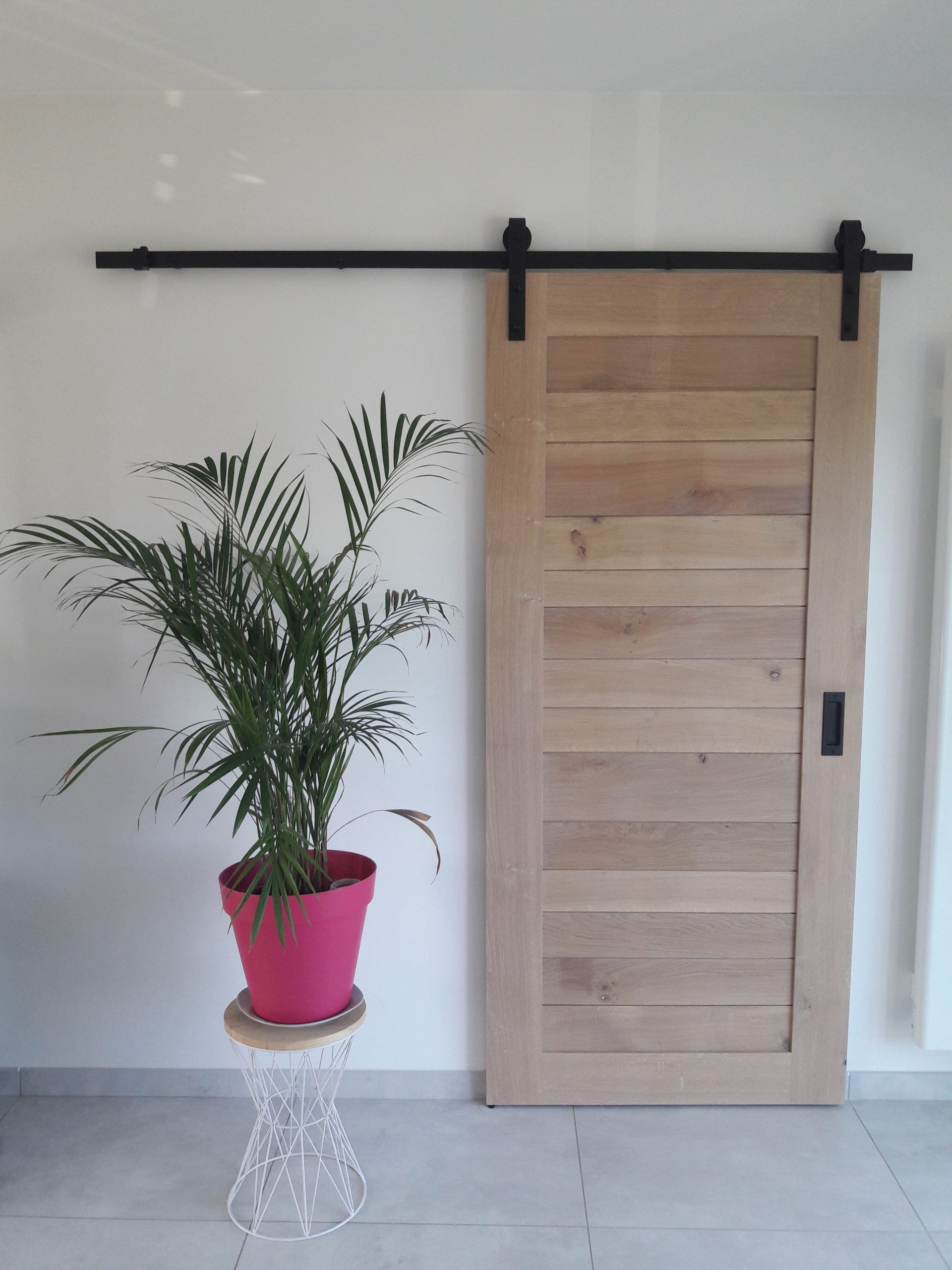 Nous avons réalisé et installé cette porte coulissante en chêne massif huilé, montée sur un rail en métal noir apparent, pour structurer l’espace de manière élégante et naturelle.